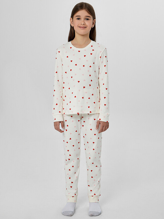 Уютный комплект для девочек с нежным узором из сердечек создан для комфортного сна и отдыха. Пижама состоит из джемпера свободного кроя с длинными рукавами и брюк прямого силуэта. Джемпер с круглой горловиной и манжетами на рукавах обеспечивает удобство и сохраняет тепло.