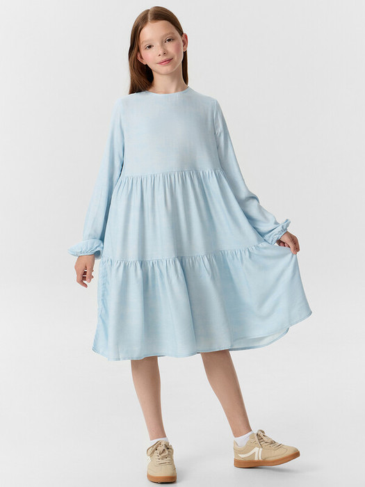 Платье А-силуэта с отрезными воланами. Горловина круглая обработана бейкой в чистый край. На спинкке по горловине разрез, обработаный обтачкой, с пуговицей 10мм и петлей из жилки вязаной 4мм (13797K, KT1-4). Рукав длинный втачной. По низу рукавов внутрь застрочена эластичная тесьма 8RV.