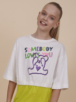 Футболка унисекс детская. Спущенное плечо, втачной рукав. Укрепление горловины спинки контрастной бейкой.