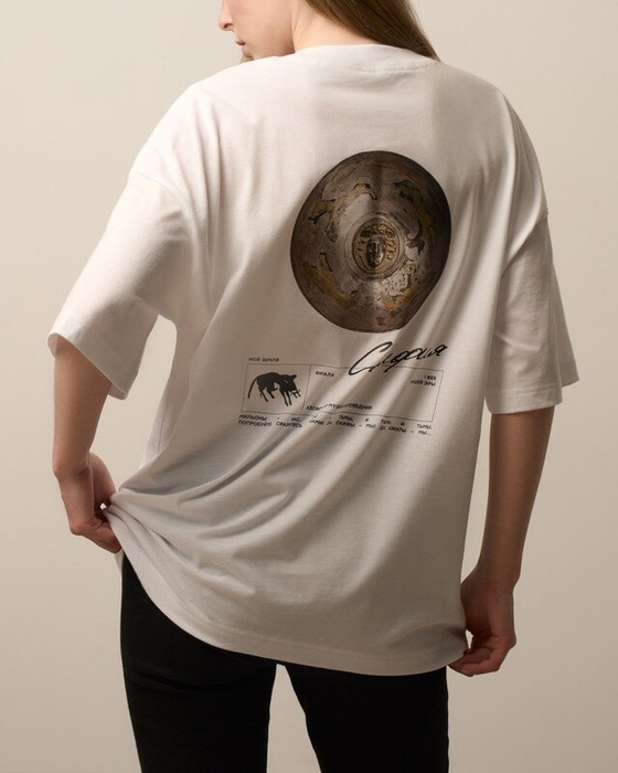 Футболка свободного силуэта. Спущенное плечо. Горловина из двух деталей, из рибаны.