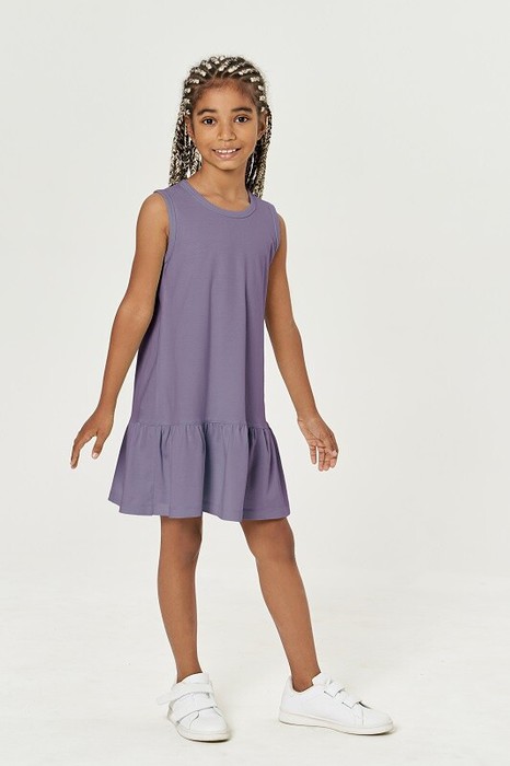 Платье для девочек. Свободного силуэта, отрезное по низу, с оборкой. Горловина и проймы окантованы бейкой из рибаны.
