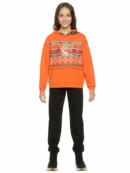 Комплект для девочек. Худи из футера оверсайз силуэта. Капюшон изнутри отделан декоративной тесьмой с вытканным рисунком, перевод Рождество. Линия плеча спущена, манжеты по низу рукавов и изделия из основной ткани. Rubber принт с золотом и глиттером. Перевод Волшебное Рождество. Брюки из футера умеренного объема с манжетами и поясом из основной ткани, карманы в боковых швах.