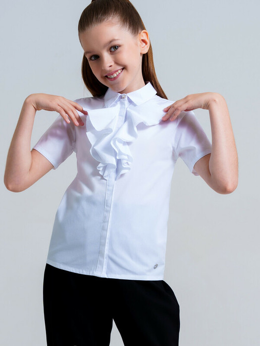 Белая нарядная текстильная блузка прямого силуэта, приталенная для девочки подростка. Школьная блузка на пуговицах хорошо держит форму, комфортна в носке и проста в уходе. Рубашка в школу с коротким рукавом разнообразит повседневные школьные образы.