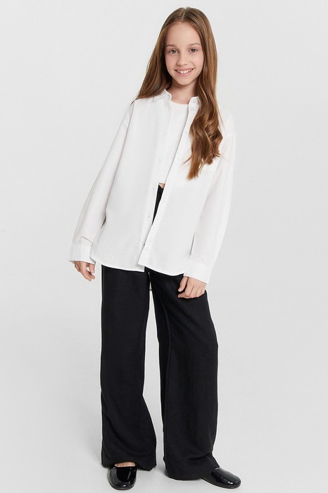 Брюки для девочек прямиго силуэта. Средняя посадка, пояс отрезной с эластичной тесьмой внутри 20RV. В поясе пробиты петли и втянут шнур из основного полотна. Низ обработан швом в подгибку.