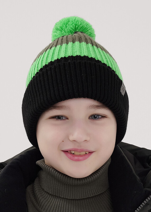 Шапка детская с отворотом и ниточным помпоном, с утеплением флисом по всей голове. Выполнена из высококачественной пряжи, декорирована стильной нашивкой в височной зоне. Станет не только отличной защитой от холода, но и модным аксессуаром.