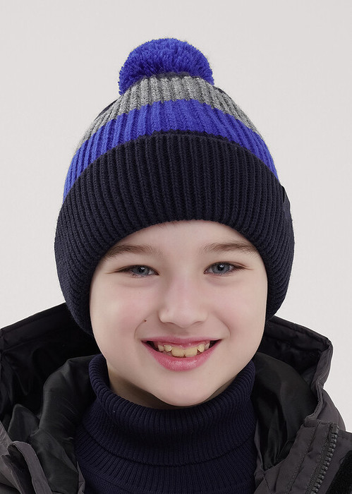 Шапка детская с отворотом и ниточным помпоном, с утеплением флисом по всей голове. Выполнена из высококачественной пряжи, декорирована стильной нашивкой в височной зоне. Станет не только отличной защитой от холода, но и модным аксессуаром.