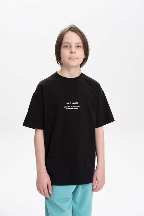 Футболка для мальчика прямого кроя - это идеальный выбор для активного ребенка. Вырез горловины обработан эластичной тканью — она прекрасно держит форму, не растягивается, при этом ребёнку удобно надевать и снимать футболку. Изделие неприхотливо в уходе. Футболка летняя с принтом на спине и надписями в стиле Digital. Перевод надписей: "your life&your ideas" - твоя жизнь и твои идеи, "make new trends" - создавай новые тренды, "think bold, listen to yourself, make new trends" - будь смелее, слушай себя, создавай новые тренды". Яркая спортивная футболка подходит как для подростков так и для малышей в детский сад. Подходит для любого времени года.