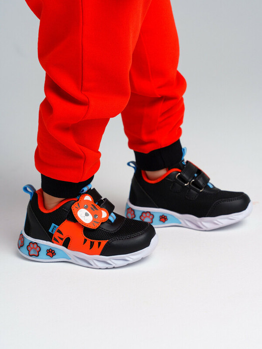 Кроссовки из дышащего текстиля  и искусственной кожи. Текстильная подкладка из хлопка обладает высокой гигроскопичностью. Кожаная профилированная стелька с анатомической формой обеспечивает правильную нагрузку на стопу. На подошва светодиодные элементы. Модель имеет широкую удобную застежку липучку с мордочкой тигра. Формоустойчивый задник поддерживает стопу в правильном положении. Эргономичная форма колодки обеспечивает правильное формирование стопы ребенка.