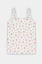 Топ для девочек прилегающего силуэта. Горловина круглая. Проймы и горловина окантованы бейкой из основного полотна. Низ изделия обработан швом в подгибку.