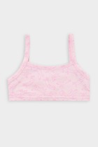 Топ для девочек прилегающего силуэта. Горловина круглая. Проймы и горловина окантованы бейкой из основного полотна. Низ изделия обработан швом в подгибку.