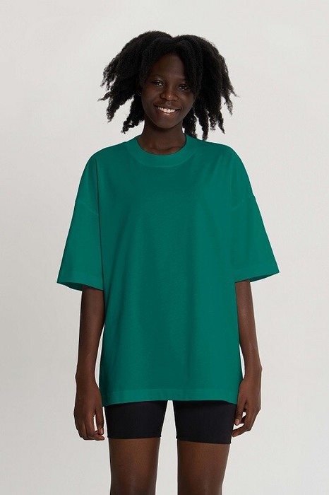 Футболка свободного силуэта. Спущенное плечо. Горловина из двух деталей, из рибаны. Укрепление бейкой плечевых швов и горловины спинки.