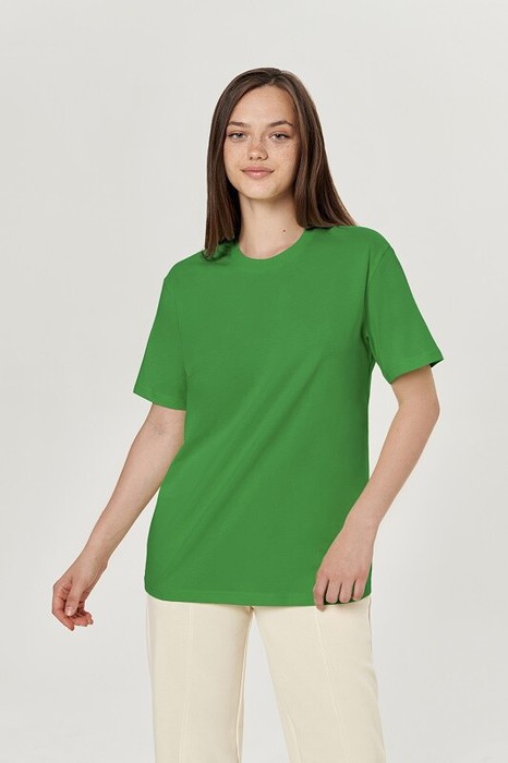 Boyfriend крой, круглый вырез. Втачной рукав. Горловина из рибаны. отстрочена по переду. Плечевые швы и шов горловины спинки укреплены бейкой из основной ткани.