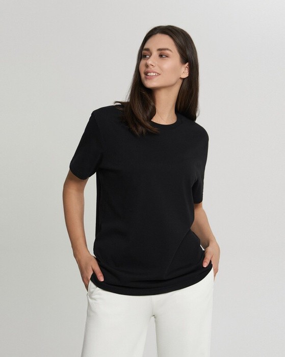 Boyfriend крой, укрепление по горловине спинки, круглый вырез. Горловина рибана. Отстрочка по горловине переда