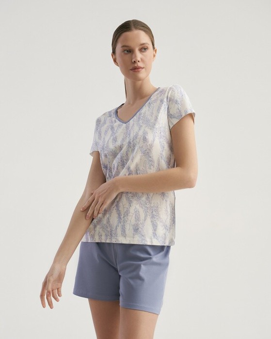 Классическая футболка, полуприлегающего силуэта, короткий рукав, с горловиной V вырезом. Укороченные шорты свободного кроя, отстроченный пояс