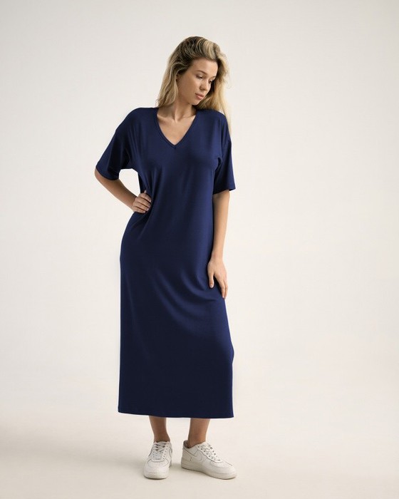 Платье, длина макси с высоким разрезом в левом боковом шве. Спущенное плечо.Втачной короткий рукав. V- вырез.Горловина окантована бейкой из основной ткани.