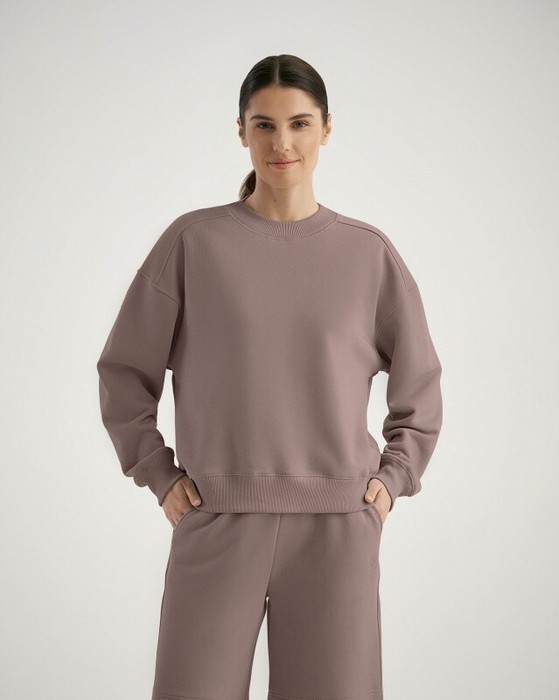 Свитшот женский с цельнокроенной кокеткой спинки. Втачной рукав с локтевым швом. Горловина с двумя швами. Пояс, манжеты, горловина из кашкорсе