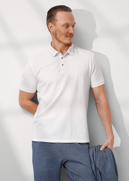 Футболка поло с манжетами и воротником, из фактурного полотна, с содержанием хлопка и полиэстера. Функциональная планка на 3 кнопки. Отличное решение для похода на работу и создания образа в стиле casual.