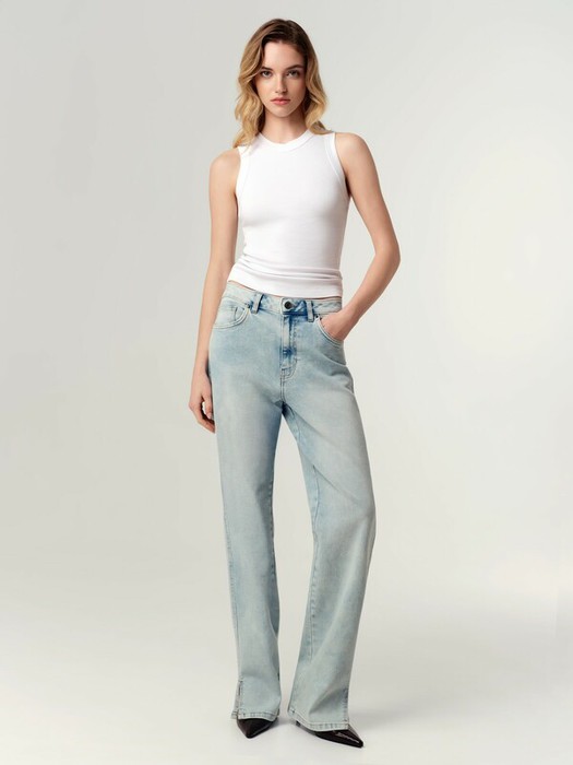 Джинсы straight небесно-голубого цвета обработаны в технике towel wash, благодаря которой ткань приобретает дополнительную мягкость и уникальный для каждой модели акварельный эффект. Аккуратные разрезы по низу добавят вашему образу лёгкость и оригинальность.