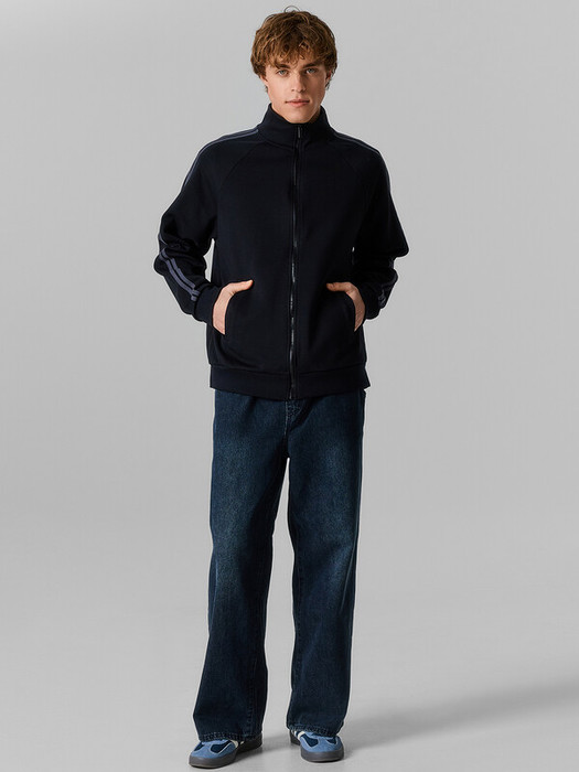 Толстовка прямая свободная, с боковыми прорезными карманами с листочкой. Горловина округлой формы с воротником-стойкой. Шов втачивания воротника по спинке закрыт тесьмой хб 10мм.Рукав реглан, длинный с отрезными манжетами из рибаны. По центральной части рукава настрачиваются лампасы.Центральная застежка на тесьму-молнию (пластик).По низу отрезной пояс из рибаны.