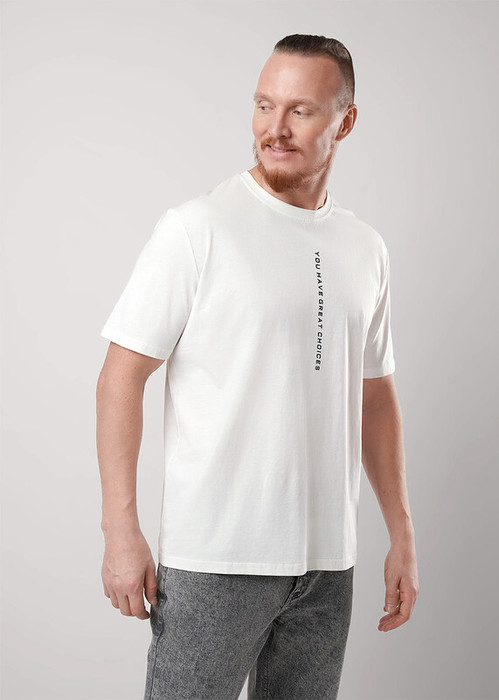 Футболка увеличенного объема с круглой горловиной из хлопкового полотна. Модель дополнена шрифтовым принтом и декоративным резом по спинке. Отлично смотрится с брюками или джинсами.