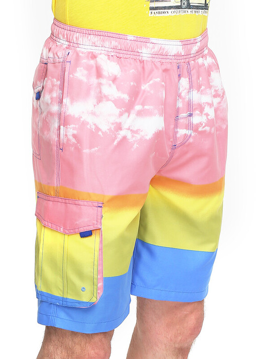 Отпускается р/р (5шт в упаковке). Пляжные мужские шорты в набивку с поясом на резинке имеют два накладных кармана по бокам и один накладной карман на липучке сзади. Выполнены из полиэстера. Модель исполнена в актуальных цветах и отлично подойдет для летних прогулок и плавания.