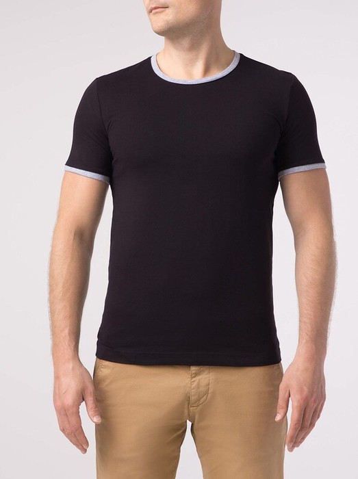 Фуфайка мужская из однотонного трикотажного полотна с коротким рукавом. Горловина круглая обработана обтачкой. Низ рукава обработан манжетами. Обтачка и манжеты изделия из контрастного отделочного полотна.
