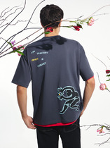 Фуфайка с коротким рукавом среднего объема, с оригинальным принтом, круглым вырезом горловины, которая оформлена обтачкой из рибаны.