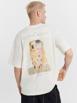 Фуфайка с коротким рукавом среднего объема, с оригинальным принтом, круглым вырезом горловины, которая оформлена обтачкой из рибаны.