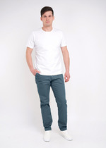 Брюки прямые, посадка средняя. Пояс отрезной с эластичной тесьмой внутри. По переду пробиты петли и втянут шнур-бейка из основного полотна с застроченными концами. В боковых швах обработаны карманы. По переду обработан гульфик с супатной застежкой на петли и пуговицы. На задней правой половинке накладной карман. Нижние срезы брюк обработаны швом вподгибку.