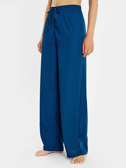 Брюки с посадкой на талии свободного силуэта. Пояс цельнокроеный с резиной внутри. По центру пояса настрочена завязка из основного полотна. Низ изделия застрочен швом в подгибку.