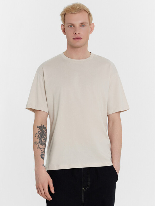 Футболка свободного силуэта. Перед и спинка цельнокроеные. Горловина круглой формы. Обтачка горловины из рибаны 1*1. По горловине проложена отделочная строчка. Горловина спинки закрыта тесьмой из основного полотна. Плечо спущено, пройма углублена. Рукав втачной, длина рукава чуть выше локтя.