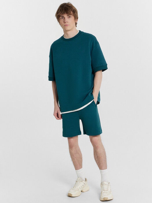 Шорты свободного силуэта. Длиной до колен. Пояс отрезной с эластичной тесьмой внутри. С внешней стороны пояса пробиты петли и вставлен шнур с эглетами. Боковые швы перенесены на деталь переда. В боковых швах обработаны карманы. Подкладка карманов из кулирного полотна. Нижние срезы шорт застрочены.
