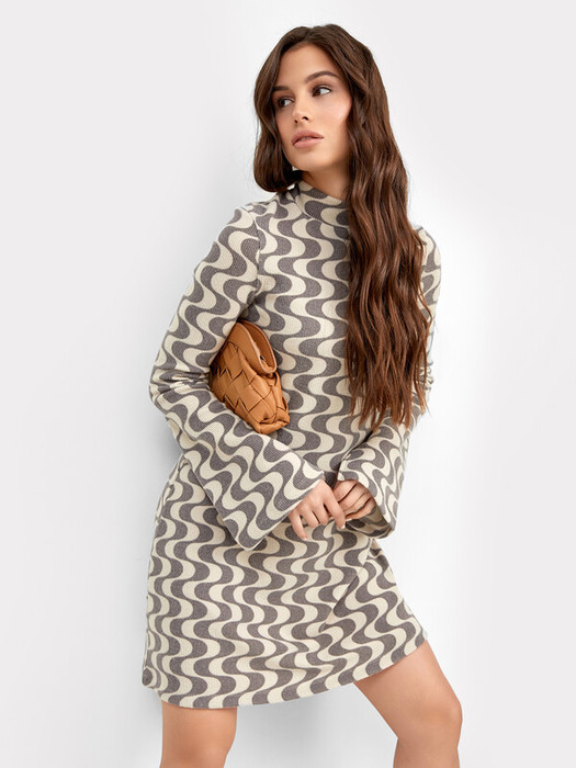 Женское платье полуприлегающего силуэта из трикотажной рибаны. Вырез круглой формы с воротником-стойкой. Рукава длинные, расширяются к низу и завершаются разрезом. Длина платья – мини, силуэт А-образный. Красиво!