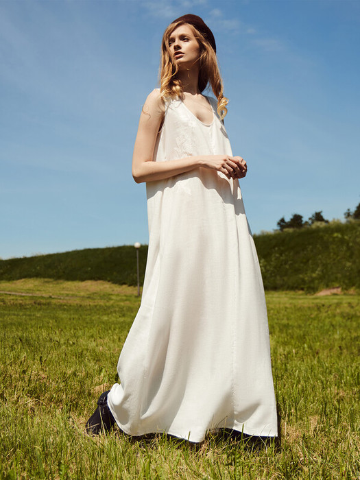 Платье изготовлено из ткани. Платье А-силуэта, длиной макси. Горловина V-образной формы, углубленная. Горловина и проймы окантованы бейкой из основного полотна. Перед и спинка со средним швом. В боковых швах обработаны карманы. Нижний срез обработан швом вподгибку.