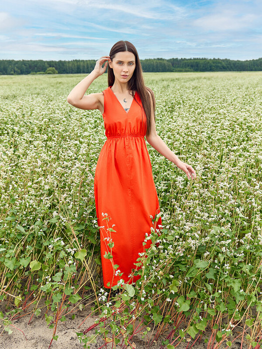 Сарафан расширяется к низу, длина сарафана миди.
