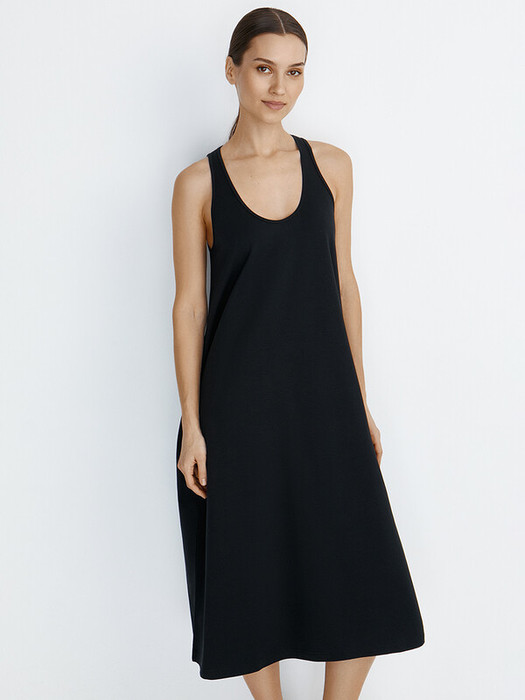 Женское платье «макси» А – силуэта с открытой проймой, глубоким круглым вырезом и карманами в боковых швах.
