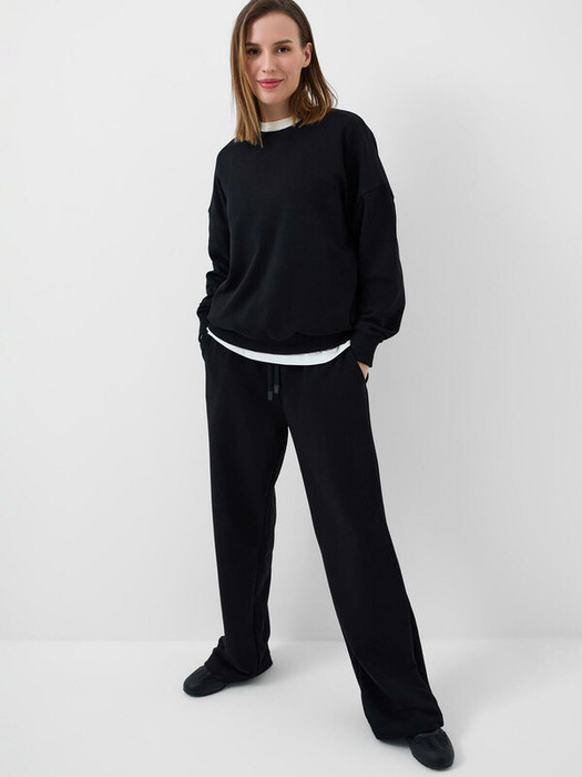 Спортивные широкие базовые женские брюки. Выполнены из хлопкового трикотажа футер без начеса. Модель свободного кроя со средней посадкой на талии. Пояс на резинке, дополнительно регулируется шнурком. По бокам — удобные карманы.