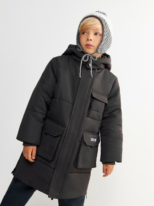 Детское утеплённое стеганое пальто для мальчика выполнено из водонепроницаемой ткани, которая выдерживает мелкий дождь и мокрый снег. Куртка утеплена синтепоном (вес 350гр/м2), что делает комфортным ношение при температуре +5 до -15 градусов. Подкладка выполнена из стандартной подкладочной ткани. Спереди расположена застёжка на двухстороннюю молнию с внешней и внутренней ветрозащитными планками; внешняя планка застегивается на кнопки. Практичности добавляют два накладных кармана с клапанами на липучках и один нагрудный карман на молнии, рядом с которым выполнена имитация маленького кармана с клапаном. Удлиненная куртка с разрезами на молнии по низу позволяет легко двигаться. Рукава с трикотажными манжетами плотно прилегают к запястьям, предотвращая продувание. Несъёмный капюшон укроет ребенка от ветра и непогоды. Куртка дополнена силиконовым патчем на левом рукаве с надписью "LEARN TO TRAVEL, TRAVEL TO LEARN" англ. - "Учись, путешествуя, путешествуя — обучайся" и принтом на кармане с надписью "EXPLORE" англ. - "Исследуй". Темно-серое пальто для мальчика поможет оставлять стильные образы в холодное время года.