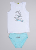 Комплект: классическая майка на 100% хлопке с окантовкой по горловине и проймам, спереди украшена принтом. Трусы для мальчика классической формы из хлопка . По талии и ножке резинка. Декоративные резы спереди .Украшены принтом.