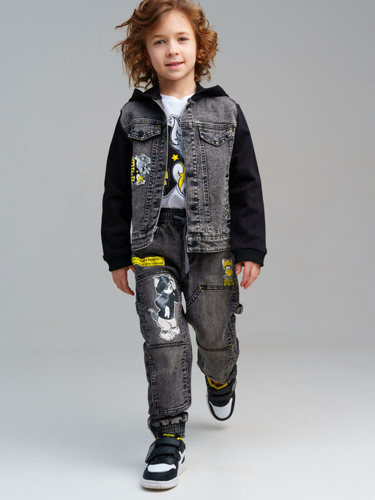 Джинсовка детская для мальчика. Куртка из сверхудобного эластичного материала Loop Denim. Loop denim имеет внешний вид классической джинсы, а по тактильным ощущениям мягкий и комфортный, как трикотаж. Капюшон и рукава из футера. Эластичный пояс с резинками внутри, растягиваясь и сокращаясь, мгновенно подстраивается под реальные размеры талии. Средняя длина. Функциональные нагрудные и боковые карманы. По низу рукавов - манжеты из риба. Застежка на кнопки.