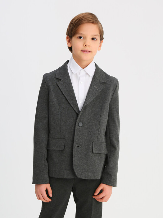 Трикотажный пиджак из смесовой вискозы полуприлегающего силуэта с английским воротником и втачным рукавом. Имитация боковых карманов с клапаном. Застегивается на 2 пуговицы.