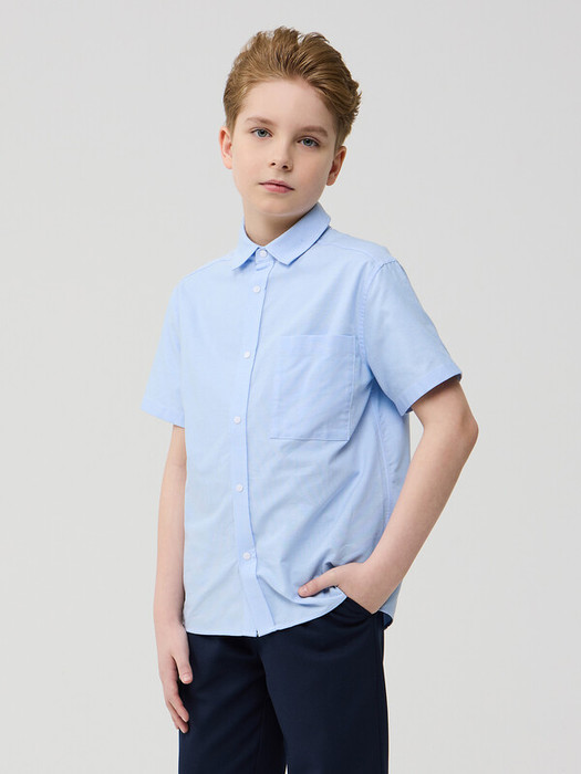 Сорочка для мальчика из смесового хлопка полуприлегающего силуэта с короткими рукавами. Воротник отложной со стойкой. Левая сторона полочки дополнена накладным карманом. Застёжка по центру переда на планку с кнопками.