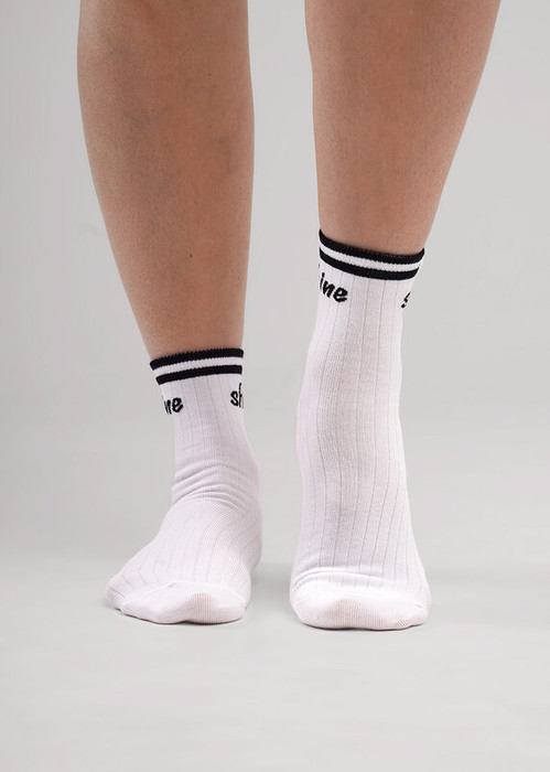 Носки для девочки с контрастными полосами на паголенке и надписью.