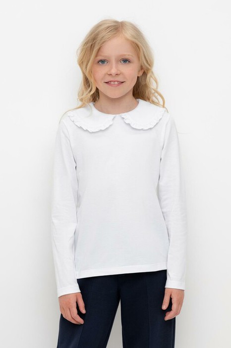 Блузка школьная для девочки с отложным воротником из трикотажа супрем. Застёгивается на пуговицу и петельку из шляпной резины. Воротник украшен оборкой. Рукава и низ изделия обработаны плоскими швами.