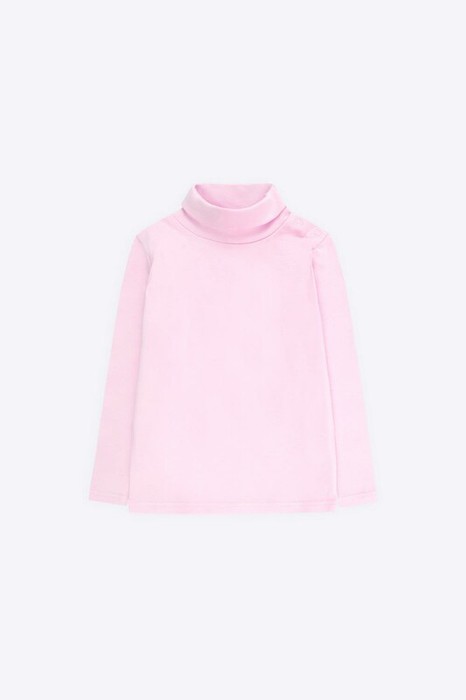 Однотонная водолазка для девочки из хлопкового трикотажа интерлок пенье. Длинные рукава. Высокая горловина с отворотом, в области плеча предусмотрена застежка на кнопки-ободок.
