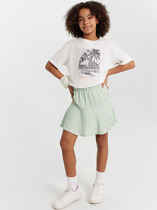 Футболка свободного силуэта. Перед и спинка футболки цельнокроеные. Рукава короткие втачные. Линия плеча спущена. Горловина круглой формы, обтачка из трикотажного полотна рибаны. Шов втачивания рибаны по спинке закрыт бейкой из основного полотна. Низ футболки и рукавов обработан швом в подгибку.