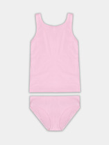 Комплект состоит из топа и трусов. Топ с боковыми швами. Горловина круглой формы. Спинка фигурная, как в спортивном топе. Подкладка по внутренней части переда из кулирного полотна SJ-6 (SJ-009.01.170),95% хлопок; 5% эластан , 180 см, 170 гр/м?. Горловина и пройма окантованы бейкой из основного полотна. По нижнему срезу топа настрочена эластичная тесьма (тесьма жаккард JT1-25), ширина - 25 мм.