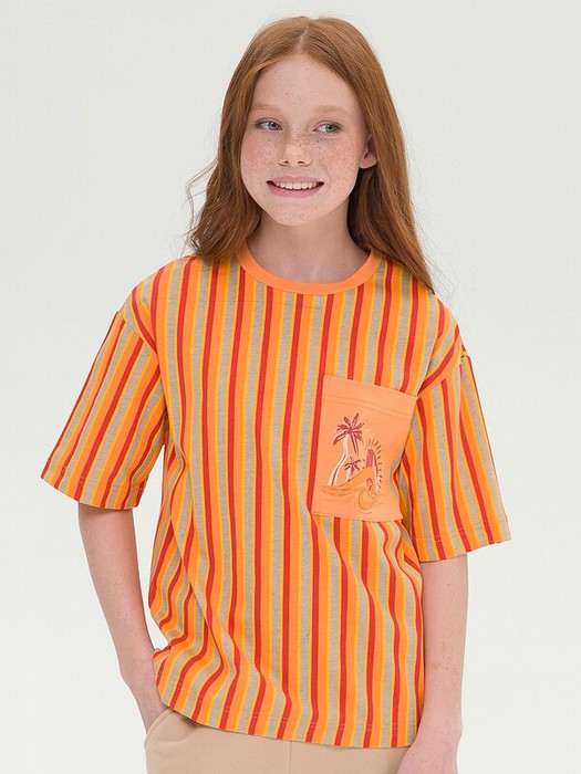 Футболка оверсайз принтованная в полоску для девочки. 100% хлопок в составе – ткань мягкая, дышащая, приятная на ощупь. Накладной карман с принтом – яркий визуальный акцент и изюминка модели. Футболка отлично подходит для создания стильного образа весной и летом в паре со слоучами или шортами. Идеальна для активного детства – на каждый день, для учебы и занятия спортом.