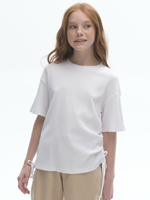 Футболка из модной ткани в рубчик для девочки. Благодаря преобладающим в составе хлопку и вискозе ткань изделия дышит и приятна на ощупь.  Эластан помогает сохранять форму. По бокам модели кулиски с тесьмой — актуальный тренд. С их помощью можно делать стильную сборку с одной или двух сторон. Такая футболка хорошо сочетается с различными шортами, леггинсами, кюлотами или джоггерами.