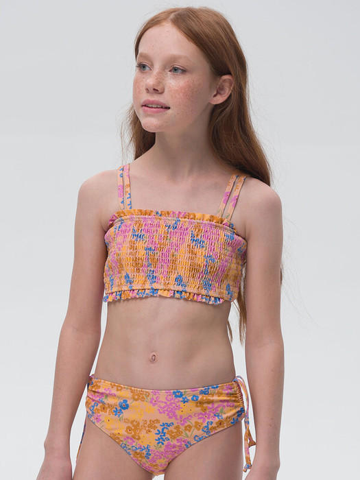 Раздельный купальник для девочек. Верх купальника выполнен в форме топа - можно носить с шортами, велосипедками. Оригинальное и практичное решение - ткань топа собрана резинками. Можно покупать без примерки. Топ на подкладе - ребенку комфортно, ничего не трет. Двойные тонкие лямки с регулировкой - можно долго носить. Аккуратная рюша по верхнему и нижнему краям придает изюминку топу. Трусики с утяжками по бокам приятные к телу, эластичные швы не вызывают дискомфорта у детей. Подходит для пляжа, моря, бассейна.